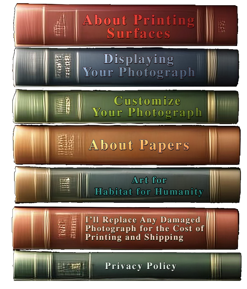 There are thousands of possible combinations of printing surfaces, framing, and finishes. The ones I offer here are the most popular or the best balance of options. In particular, the framing and matting of Paper prints gets complicated. Please don’t hesitate to reach out to me with your specific wishes. If you want to explore the diverse options available, please visit one of these online printing services. These are the professionals I work with: Bay Photo and WHCC (White House Custom Color).
